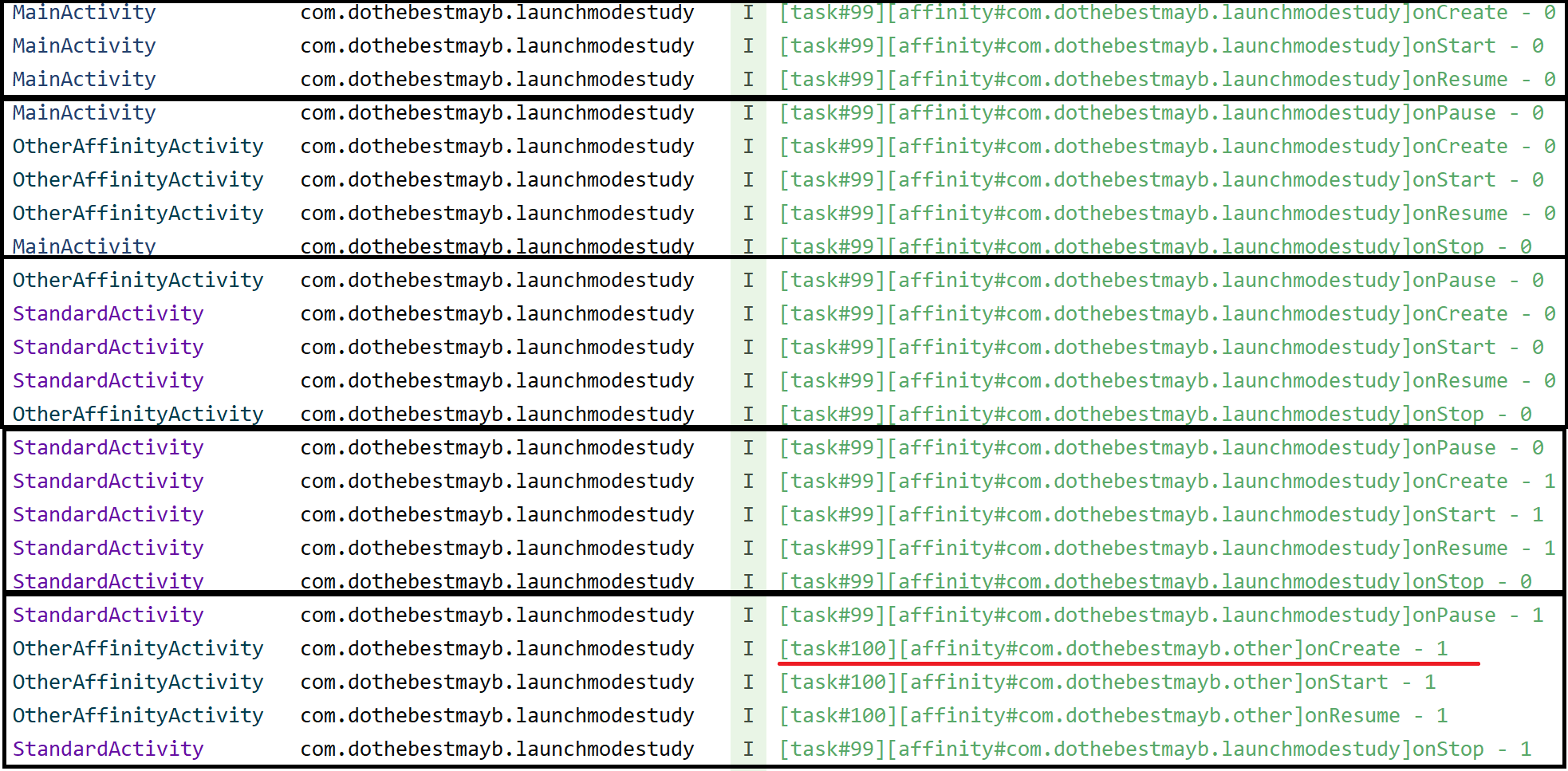아래 로그는 다음과 같은 순서로 Activity를 실행한 결과입니다. manifest 파일에서 다른 taskAffinity를 명시한 Activity에 대해 FLAG_ACTIVITY_NEW_TASK를 포함해서 실행하면 별도의 task가 생성되는 것을 확인할 수 있습니다.