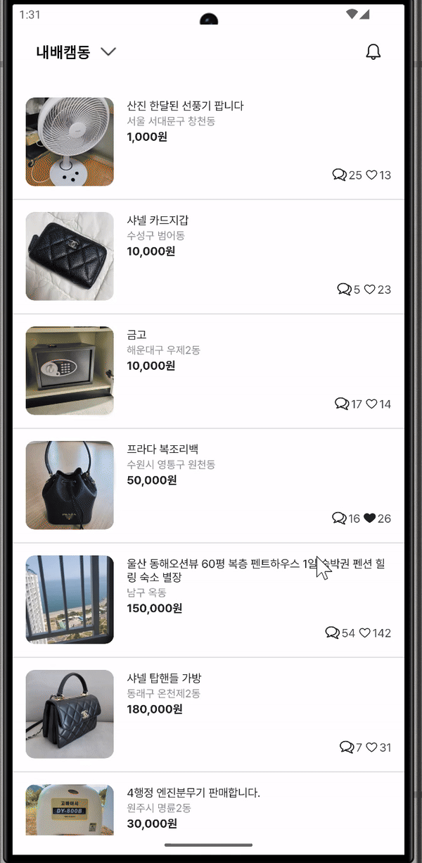 내일배움캠프 앱개발 숙련주차 개인 과제로 당근마켓과 비슷한 간단한 앱 만들기를 구현했습니다.